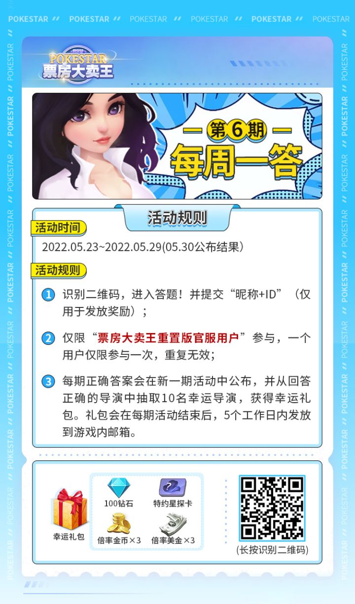 点击链接参与答题======今日宝箱=======礼包码:zyfl07有效期:5.1~5.31使用条件:仅限票房大卖王(重置版)官服用户使用内容:点赞数*1000、倍率金币*1、倍率美元*1、1星资产礼盒*60