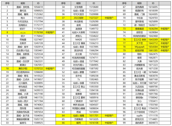 感谢458名导演支持!【每周一答】第6期顺利结束,全部回答正确的导演有99名(正确答案:BBBAB),已从中随机挑选出10名幸运导演,获得幸运礼包。(礼包将在5个工作日内发放到游戏内邮箱)全部回答正确导演(如下)==========幸运导演==========༺༽༼༻ 舞在夕阳2022发财 仙剑༒魂殤姬同 雅雅集团【江川】突突 天下艺Miyayeah 起名好烦======今日宝箱=