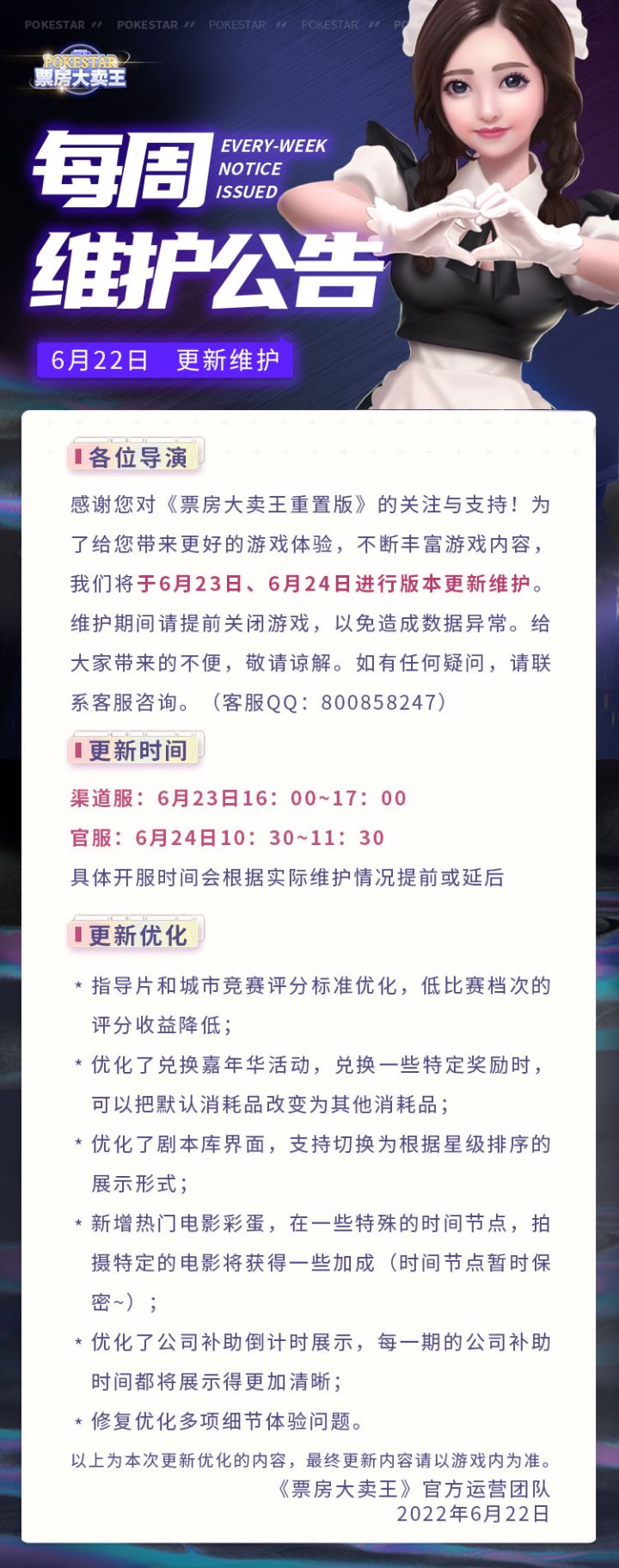 感谢您对《票房大卖王重置版》的关注与支持!为了给您带来更好的游戏体验,不断丰富游戏内容,我们将于6月30日、7月1日进行版本更新维护。维护期间请提前关闭游戏,以免造成数据异常。给大家带来的不便,敬请谅解。如有任何疑问,请联系客服咨询。(客服QQ∶800858247)【更新时间】渠道服∶6月30日16∶00~17∶00官服∶7月1日10∶30~11∶30具体开服时间会根据实际维护情况提前或延