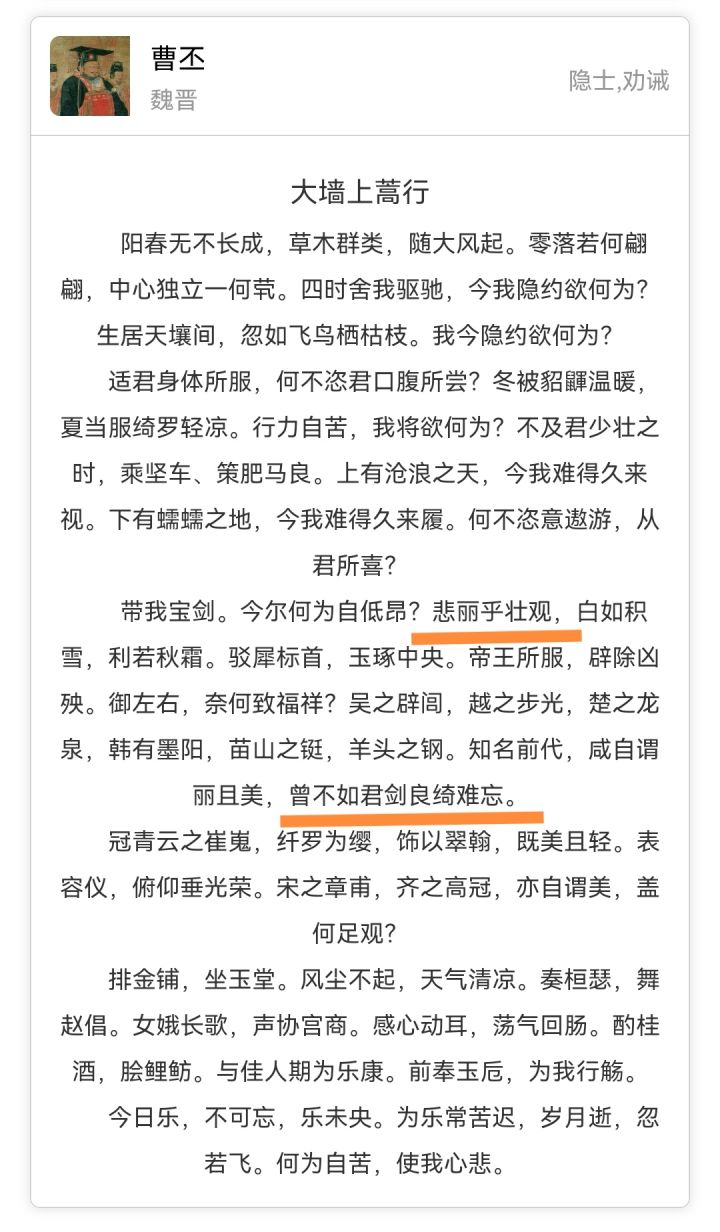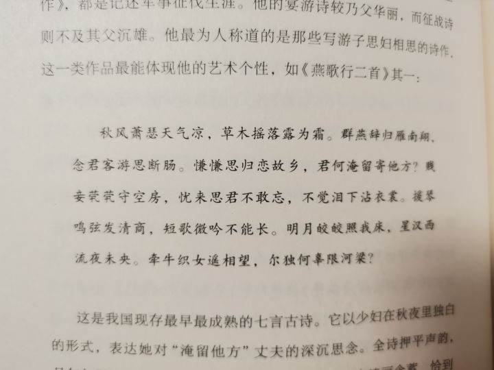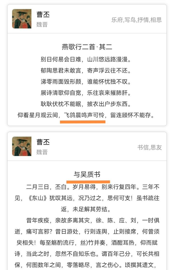 关于曹丕的其他几个bugp1 大墙上蒿行中两句有误,应为:悲丽“平”壮观(平为正)曾不“知”君剑良绮难忘p2燕歌行其二中一句有误应为:飞“鸧”晨鸣声可怜(鸧为鸧鹒,是黑枕黄鹂,和鸽子是两种不同的鸟)与吴质书题目错误,实则为 又与吴质书(开头为:二月三日/ 出自《三国志·王粲传》/ 作于建安二三十年)原本《与吴质书》的内容全名为《与朝歌令吴质书》(开头为:五月二十八日/ 出自《文选》卷四十二/ 作于建安二十年)