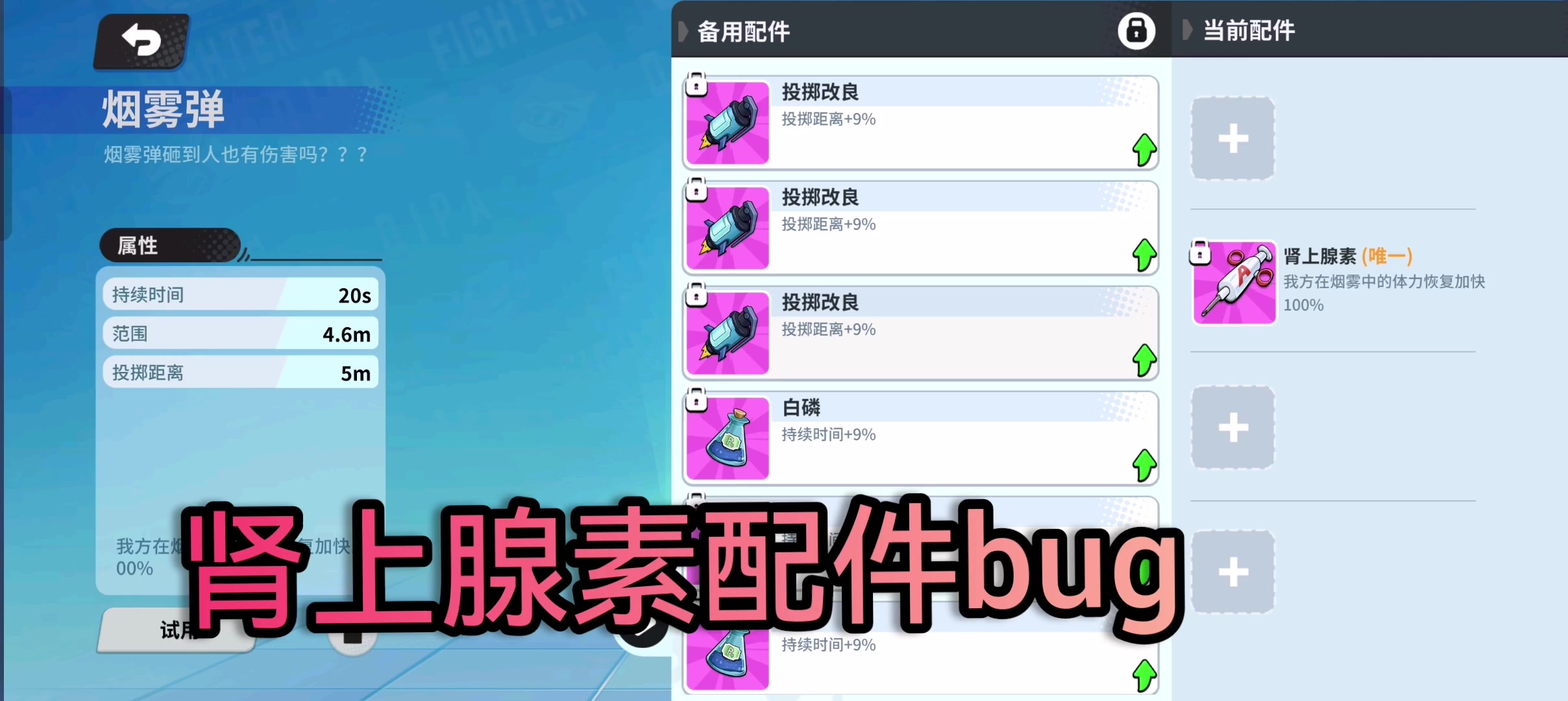 从这个配件出来之后就发现了,但是一直到现在,应该已经有一、两年了,还是没有修复,究竟是除了我之外没有人发现还是一直没来得及修复呢?[表情_捂脸哭] 具体描述如下: 烟雾弹装上(肾上腺素)配件后丢在地图中,明日希和迈克(不过在某次更新后迈克被增强,按住迈克的二技能不再持续消耗体力,所以现在应该只剩下明日希有这样的效果了)进入后按住二技能不松开,即使离开烟雾弹也可以持续很长时间的二技能,此状态只要不被