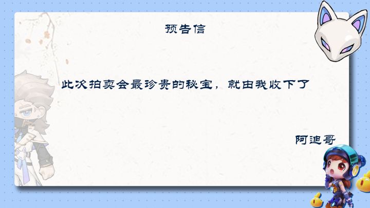 奇葩新鲜报——来不及念口号了!琪琪警官!报案!!“怎么一大早就慌慌张张的...这是什么?”琪琪本来还在犯困,看清小扫扫手中信纸内容的瞬间就激灵了:“这什么?!预告信?”原来小扫扫本来正在收集秘宝赛季的相关情报,据说本次赛季开启时,享誉奇葩大陆的珍贵秘宝即将在奇葩最负盛名的拍卖行——星空拍卖行进行正式拍卖,而拍卖行的主理人正是当下最炙手可热的大艺术家星奈。结果消息还没整理完,就从星奈那里听说拍