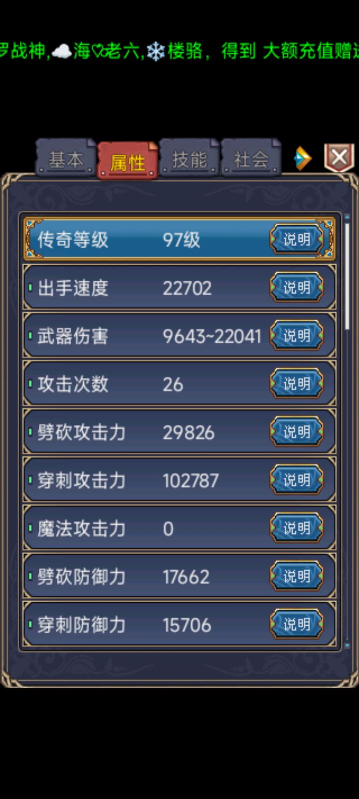 注*为了呈现出最佳效果,本攻略的属性数值,都是基于装备满属性的基础上计算得出,这种满属性装备是极难鉴定出的。职业:侠客称号:吉尼斯生命达人(盾2,伤免20%)♦【装备】武器:天魔惊神の刃【雷】攻击:1406-2738命中:240攻击次数:3破甲+3256命中+444用剑时攻击次数+4剑类武器伤害、耐久+67%(绑定)穿刺攻击力+67%(绑定)1件:剑类武器伤害、耐久+50