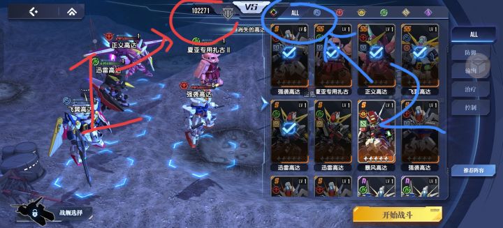 不知道是不是我的屏幕尺寸问题,还是Ui界面的设计没考虑到,红色1是我方战力,蓝色2是敌方战力。选机甲界面完全遮挡住了敌方战力