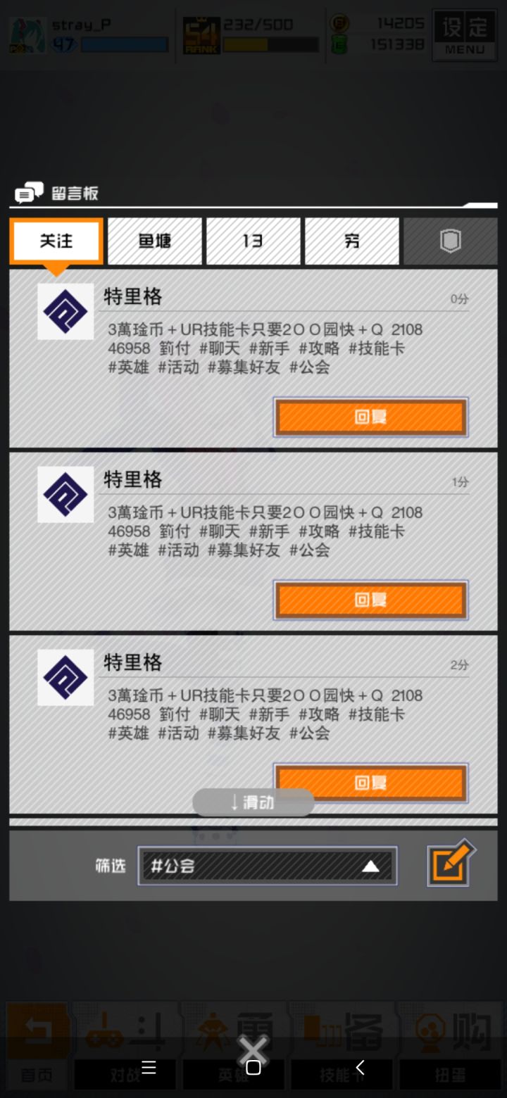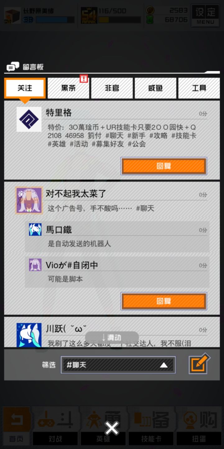 这个号不间断地在留言板发送广告甚至成为社交达人了请看见的玩家关注举报取关一气呵成(草)官方快封掉吧希望官方能有自动监测短时间大量发留言号的机制然后再人工检查这些号发送的内容是否为广告(萌新建议,可能不可行emm)不过连康康都有广告号了或许反向证明康帕斯要火(?)