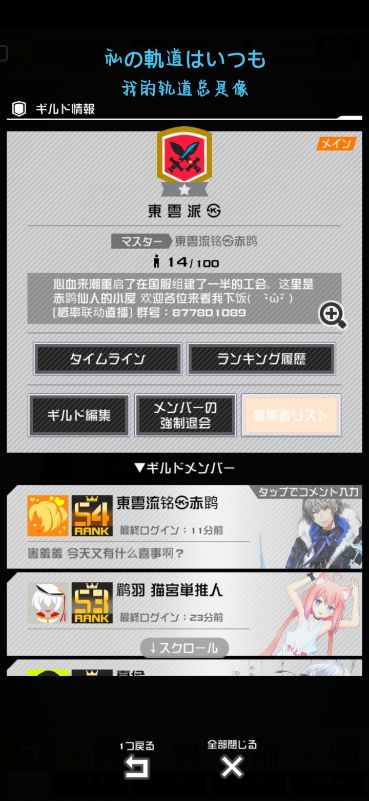 公会缺人 紧急招新 国日合计1w7000场经验 擅长跑职的赤鹍仙人现在开始!重新组建自己的公会 欢迎新人和大佬前来做客 分享职业技巧 配卡思路 以及野人战斗法! 東雲会现在已经有16名成员 周常任务可以基本保证玩成(会长好强度爆肝)日服搜索東 雲 派 ㉿即可加入 无任何要求 无需认真 开心就好!ε(*・ω・)_/゚:・☆