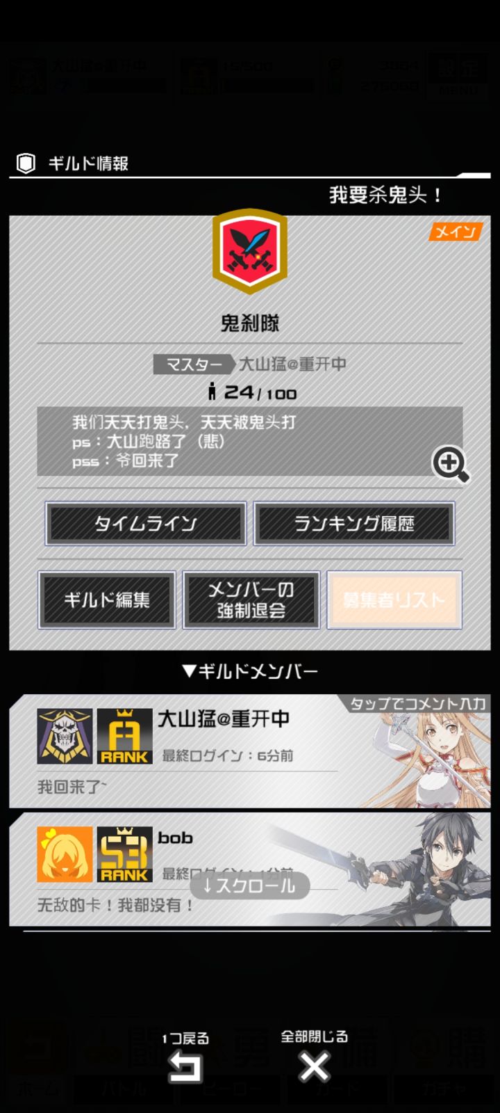 我是真的没人缘。加别人的公会人又满了我不知道怎么办然后自己创了公会又没人,我走头无路了就来这里求人了。。。谁都可以!我不会踢人!只求有人进(。Q AQ)。国服日服都有公会,如果和我一样孤独的可以来。(泣)Q群:559150092拜托大家了!。(≧ ∧ ≦)。