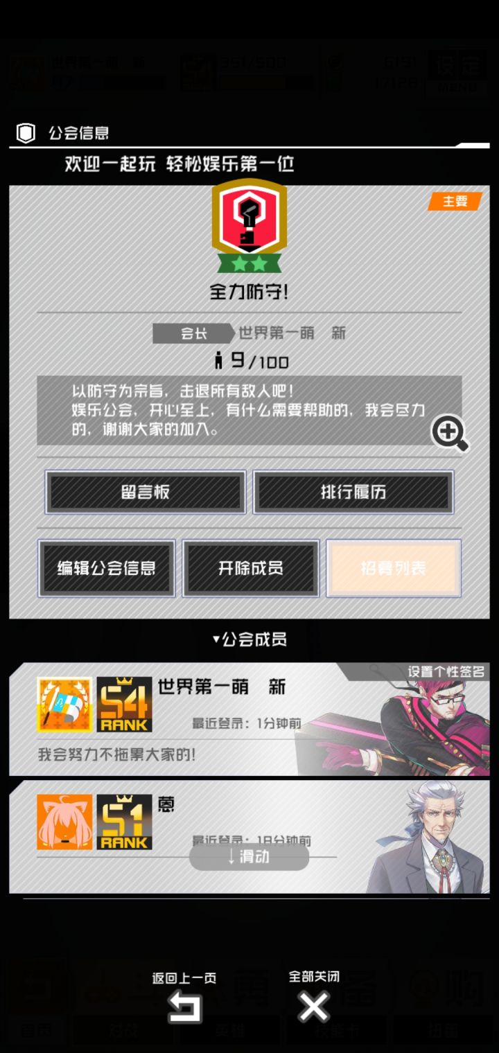 赛季结束啦 所以再次来招人啦只要你公会还有空位欢迎加入不敢说冲榜 但可以让很多萌新有个地方有不懂的也能留言板问 我会努力帮忙的 希望能一起让公会冲到三星对了 输公会名记得 ! 哦~