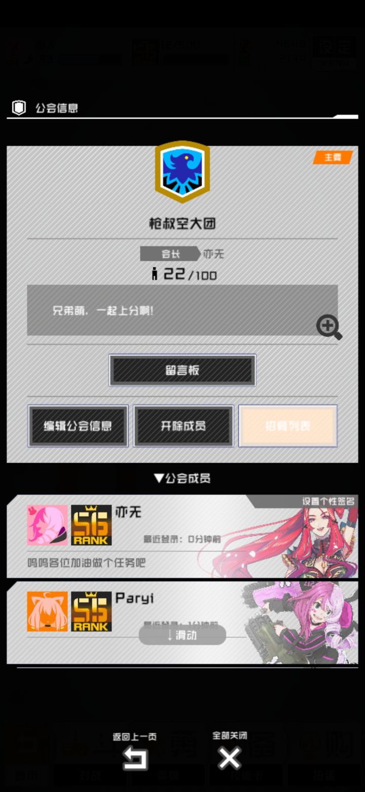 公会名:随心所欲摸鱼会我是一台咖啡机,公会只有两个人,打公会任务很辛苦,一个百战任务,我打了六十多战。辛辛苦苦带娃(迫真)所以各位如果公会没有满或者想找一个公会的来玩吧,打公会任务太辛苦了(悲)