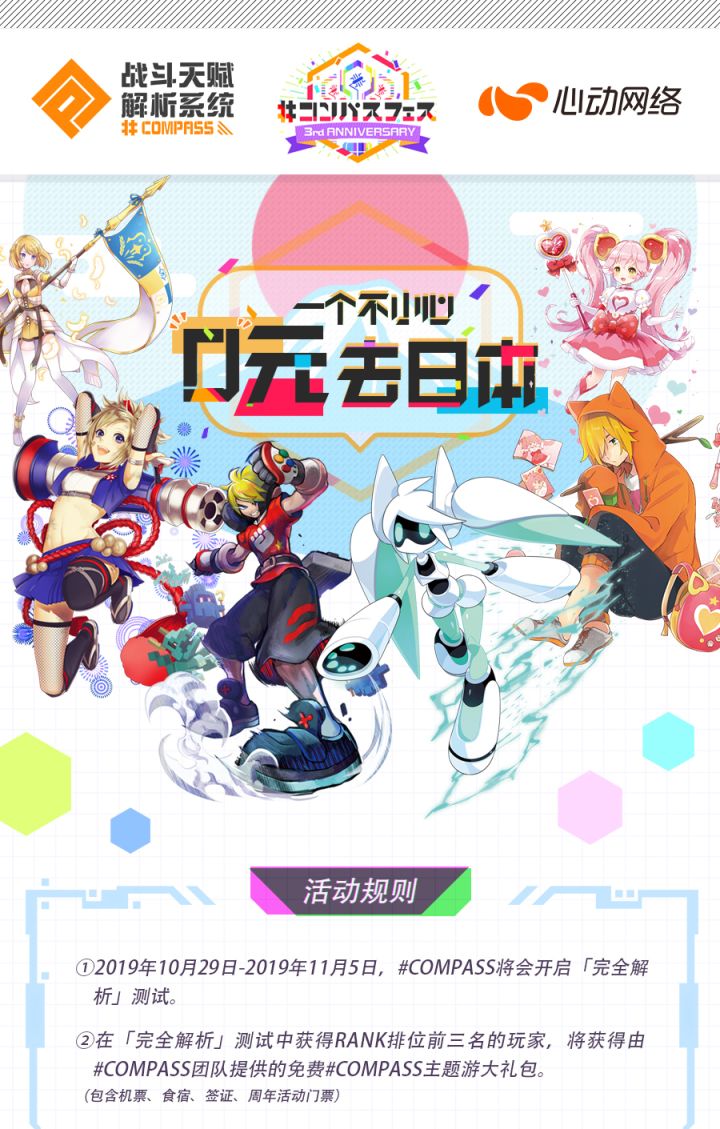 注:本次活动排行榜数据将截止至11月4日14:00,还请各位冲榜的大佬不要忘记最后的冲刺时间~大家好!发布一则消息,2019年12月8日,我们掏腰包带你去日本!!2019年10月29日-2019年11月5日,#COMPASS将会开启「完全解析」测试。请各位积极参与,游戏奖励正安静地躺着等你!「完全解析」测试结束后,我们将带领RANK排行榜前3位的玩家(坐飞机)前往日本(免费!)参加日服#CO