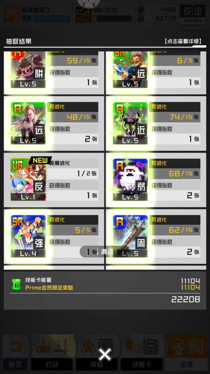 角色券多的很抽完卡都40多张了,抽完角色后还有30张左右,好在抽出了哥哥同款皮肤。但是一万金币第一发6种sr,第二发3种sr和一个妈弱,想要的一个没出来。然后两次抽奖ur正好抽出个全除,昨天我还在为自己的非洲运气而伤心,今天先是90金币(为了任务里抽奖任务)出来个超加速,可以加二了……但是我不用超加速,这个可以略过,晚上随手开了几个晶,然后竟然开出反导我成为康卫兵了