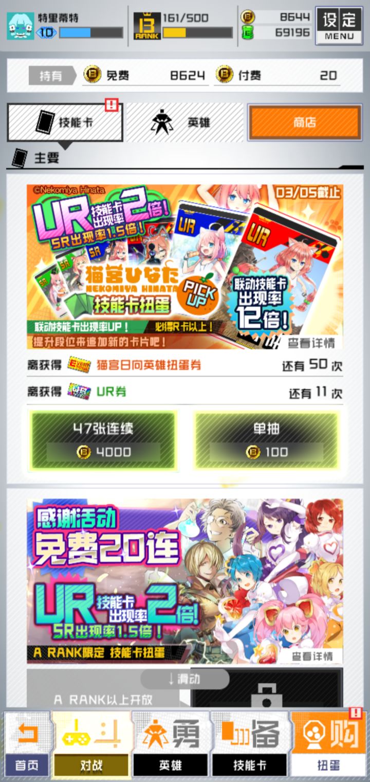 啦啦啦,第一次是“对A”第二次是猫老大虽然一张UR都没有。。。。。是的。两次60连,一张UR都不给我。。。。呵呵