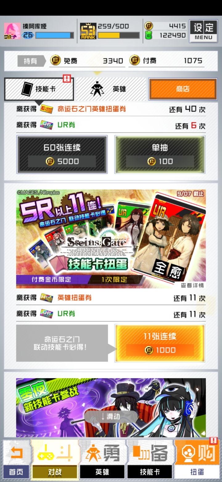 有些人总是无法拜托非酋的命运。开服到现在每次联动没有一次出率是正常的,换了个号结果也是一样。初音12发出,一共给3张联动ur(加抽了全部付费bm项目)。猫宫记得是5发搞出个皮肤,1张联动ur。阿姨零10发,这次爆率还好,但是两张4/5。素晴总共是花了6万bm,联动ur俩,常驻给了三张废物。这次石头门把全部皮肤轮一次,可可重复一次,才出胸针,ur就给四张(一张夺强)。不仅国服是这天才爆