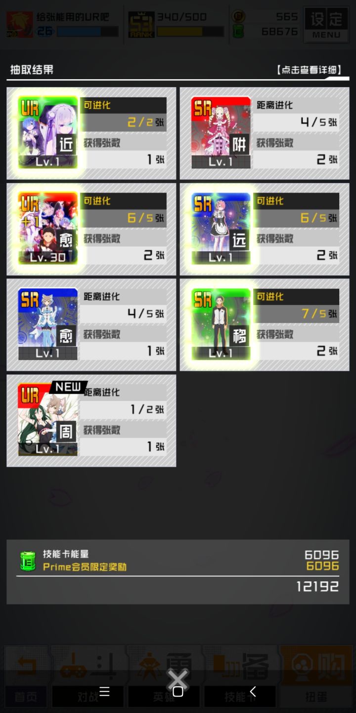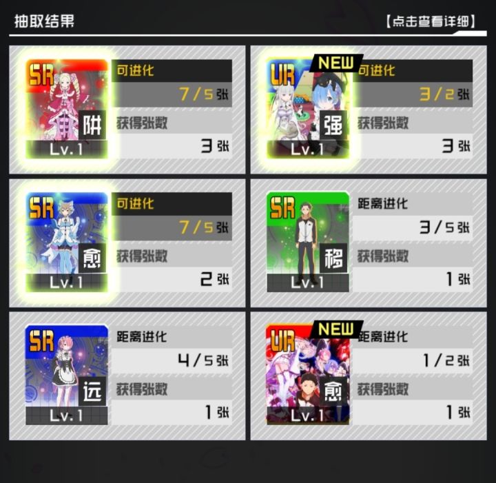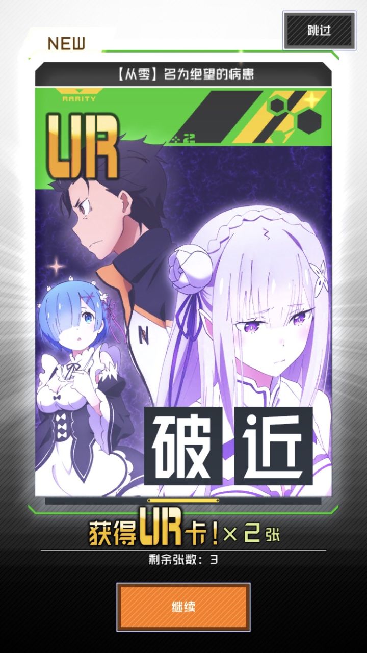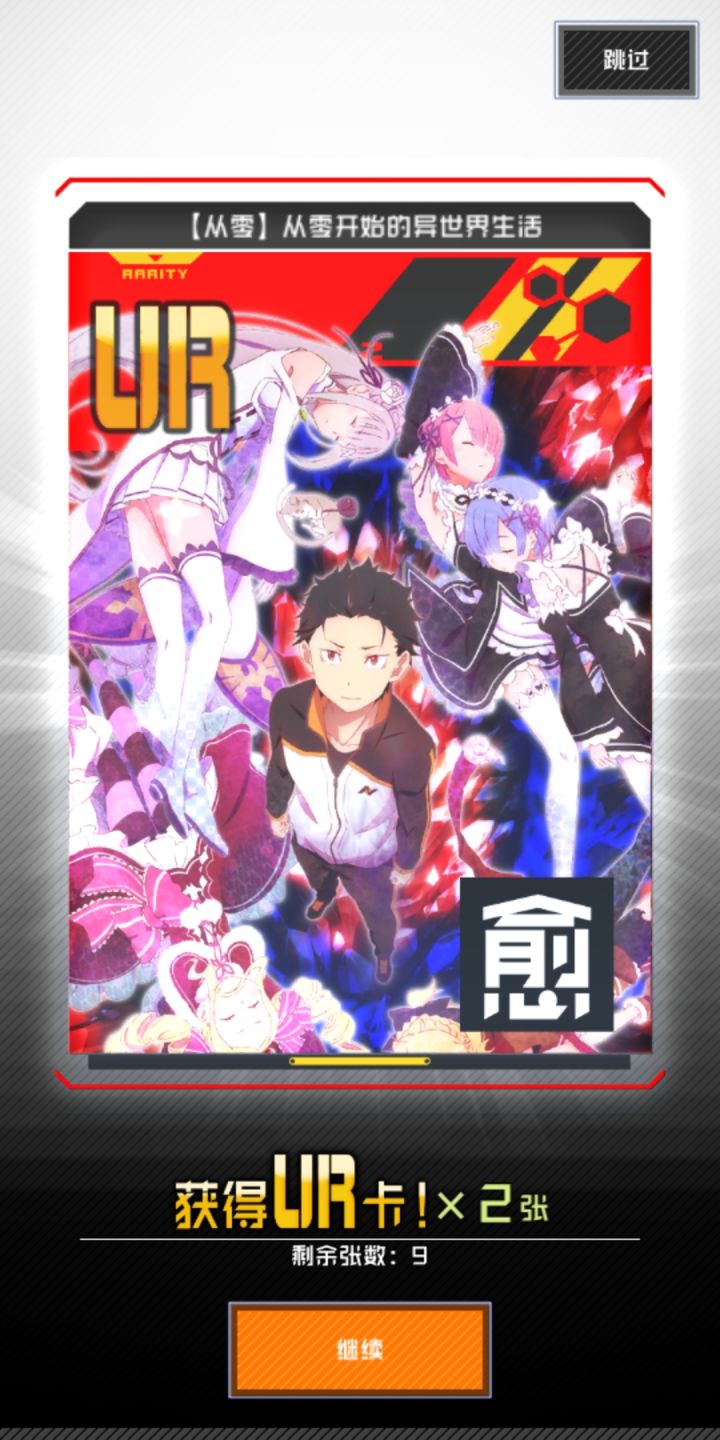 刚抽完付费11连,打算此次联动收手了,来分享一下抽卡经历吧。第一次抽卡,三张红百愈,9张sr,还有毒叔皮,很高兴,于是没忍住,接着抽。第二次四张UR,4张sr,有红百愈和妈弱不过只有llk皮,为了+2红白愈也为了蕾姆抽了第三次,结果就一个废UR,不过蕾姆到手了,也没bm了,缓了几天,越想越气,怎么红百愈不+2呢?于是疯狂挖矿,抽了第四次,结果沉的很彻底,只有联动近破,还有和服蕾姆皮,本来打算放弃
