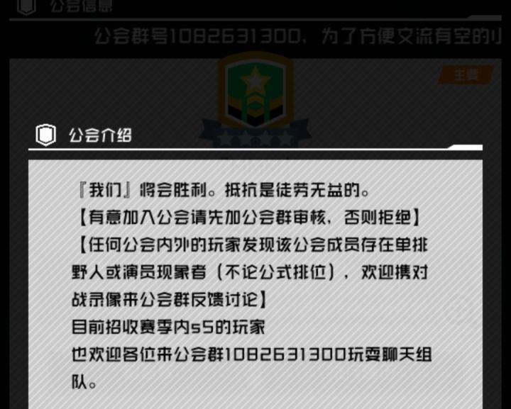公会“神秘结社MMM”第十一赛季结束招新~大概有6个位置,请加群提供自己的赛季履历以供审核~虽说公告板标识的是招募赛季内S5,S4也可以酌情考虑当然,进来玩也是可以的~【任何】公会内外的玩家,若发现该公会成员存在单排野人、演员现象者(不论公式排位),欢迎携对战录像加群反馈讨论我们认为任何单排野人和演员行为都是对随机队友的不尊重与不负责任,以及对这三分钟时间的浪费。公会内会提供一定配卡以