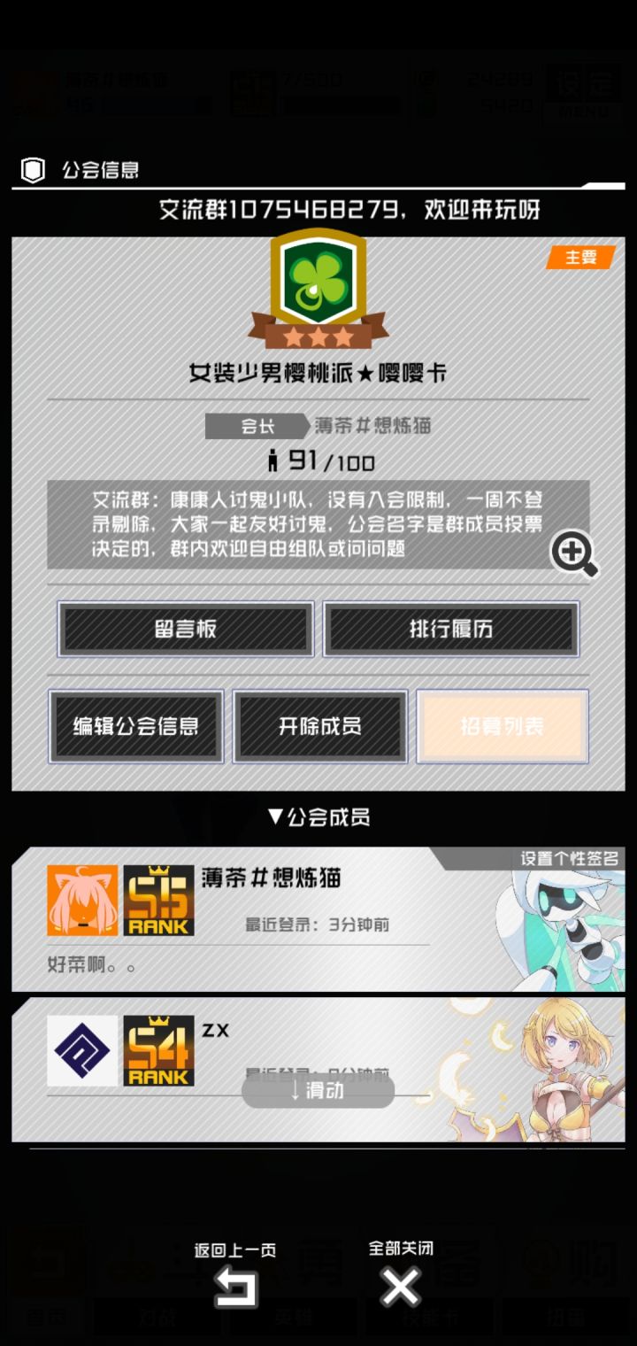 欢迎大佬加入,欢迎萌新提问,热心群友会解答你的疑惑工会 1.女装少男樱桃派★嘤嘤卡2.讨鬼の豚小屋工会没有rank等级限制,只为给群友方便,只要你不长时间不登录即可群为交流群不强制入会加入群内细则详见群内公告自由组织车队