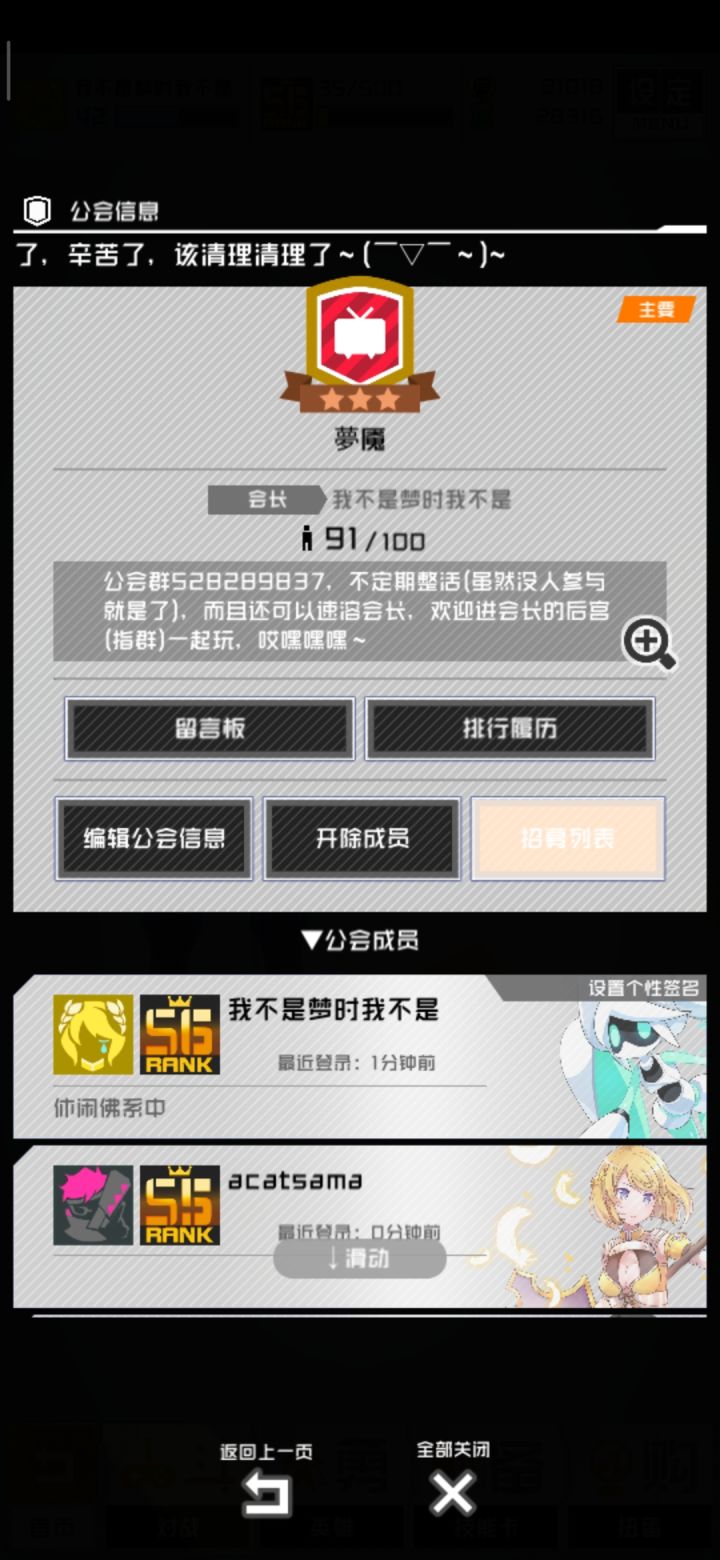 这个公会嘛,也不知道说什么好,嘛,会长可以溶,可以溶会长,进来一起溶会长啊(自己迫害自己),或许想加入me后宫也不是不可以,哎嘿嘿嘿准备举办有奖整活(送会员哒),已经开始投票准备了,心动不如行动,进公会然后进群吧虽然限制是s4,不过活跃的大佬进不了可以先进群,让会长改改就好~( ̄▽ ̄~)~