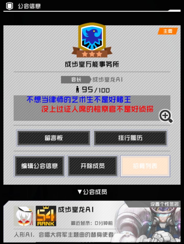 欢迎准备长期玩下去的萌新加入MO!现在已经改为无段位限制,随时即可加入了MO!欢迎喜爱枪叔和迫害枪叔的所有玩家MO!ps:有组队聊天的公会群MO~(内有龙王群主和水群成员以及数位阴兵MO)公会群不强求加入的MO~这里德川保留 混眼熟~