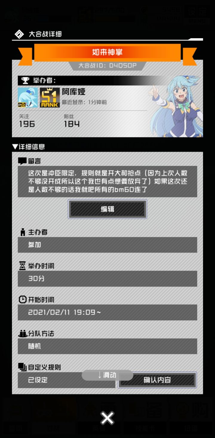 胜利条件:淘汰赛制,打到最后的队伍将是冠军队伍。比赛规则:BO1赛制,失败即被淘汰。卡等50固定,为照顾日服新玩家,卡组限定为(2sr,2ur限定,徽章无效),队伍中职业不能重复。tip1:连赢3把将获得一次复活权(复活权必须在被打败后的5场内使用)tip2:连赢5把获得一次休赛权(使用休赛权后,必须在5场内重新上场比赛)奖品:冠军队伍每人获得3000日元谷歌或者苹果的礼品卡。队伍报名: