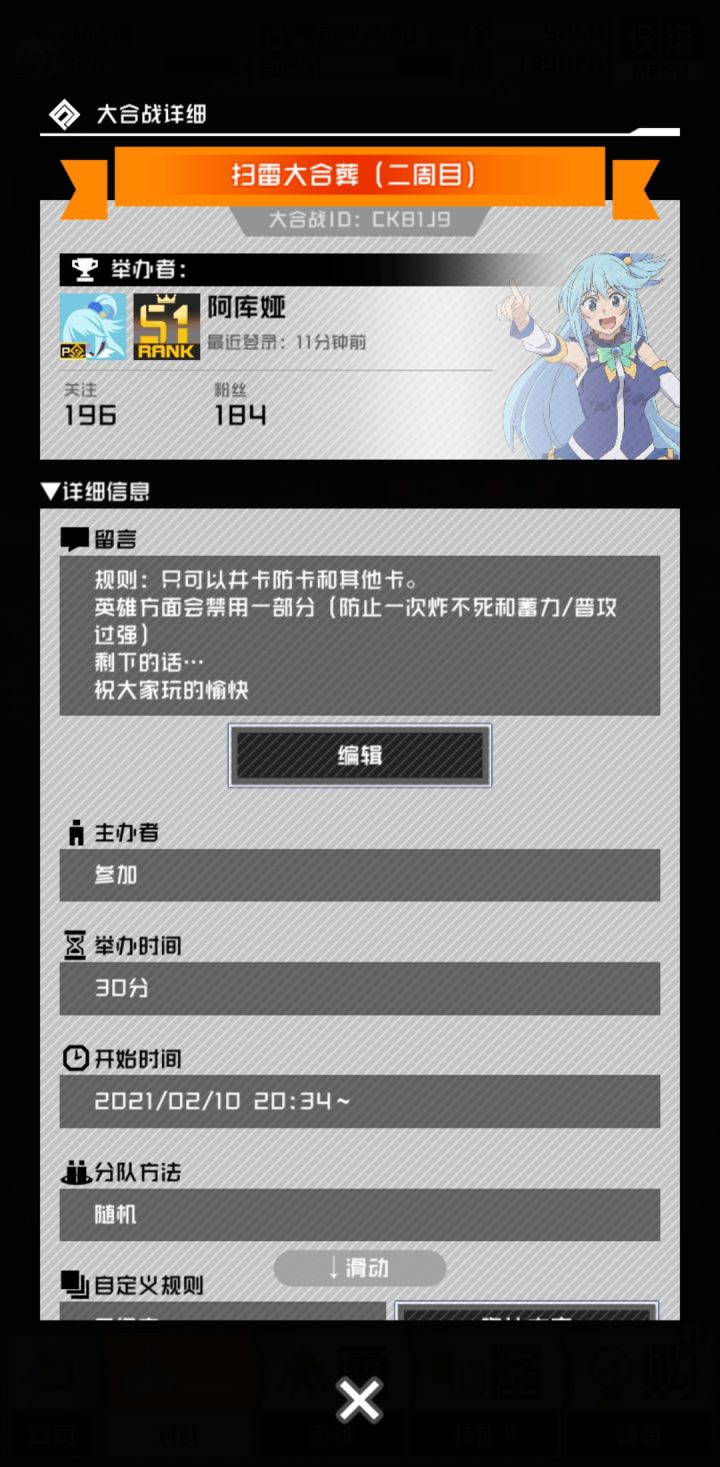 明天晚上八点我会开一个大合葬,希望大家可以来捧捧场规则大概就是禁用近远周连和大部分功能卡,只保留井卡防卡和其它卡。emmm然后就是禁用了一部分英雄?希望能够顺利展开吧,最后祝大家全体出货