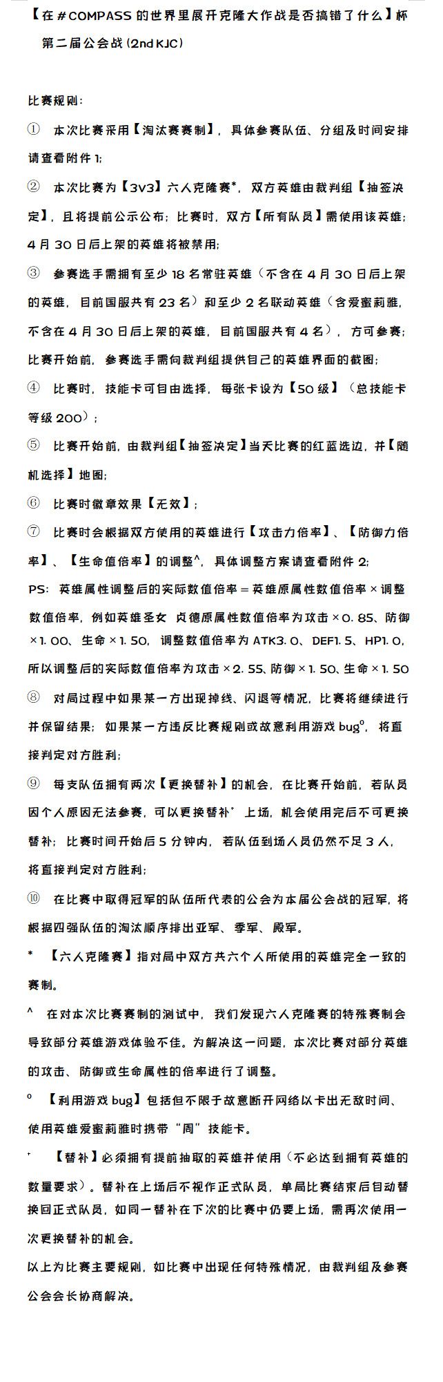 比赛进行中!比赛日志传送门:【在#COMPASS的世界里展开克隆大作战是否搞错了什么】杯第二届公会战(2ndKJC)比赛规则:① 本次比赛采用【淘汰赛赛制】,具体参赛队伍、分组及时间安排请查看附件1;② 本次比赛为【3V3】六人克隆赛*,双方英雄由裁判组【抽签决定】,且将提前公示公布;比赛时,双方【所有队员】需使用该英雄;4月30日后上架的英雄将被禁用;③ 参赛选手需拥有至少18名常驻英