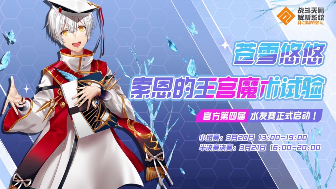 V酱来啦V酱来啦,时间过的超快鸭!新一届的水友赛就要开始咯,大佬们想我了没?想我的话就让我看到你们的小手。想必大佬们也猜到V酱我接下来要说什么了,V酱今天携手COMPASS苍王宫的宠儿索恩来给大家带来「苍雪悠悠 索恩的王宫魔术试验」COMPASS第四届官方水友赛,大家掌声鼓励鼓励!先让我们看看「苍雪悠悠 索恩的王宫魔术试验」—第四届官方水友赛,小组赛的对战名单吧!选手们认准队名,在对应时间找V