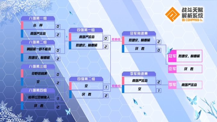 各位大佬们,这里是V酱,嘻嘻!(●'◡'●)经过两天的激烈比拼,COMPASS官方论坛第四届水友赛 「苍雪悠悠 索恩的王宫魔术试验」已正式结束,V酱非常感谢所有参赛选手们!!!本次由我建议,躺着输队、厌胜队和雨落严流岛队凭借高超的操作和精妙的配合斩获我们的冠亚季军!让我们恭喜他们!!!Duangduangduang!刺不刺激!大家互帮互助走到了游戏最后,我们一起给他们鼓励鼓励!!!除此之外,