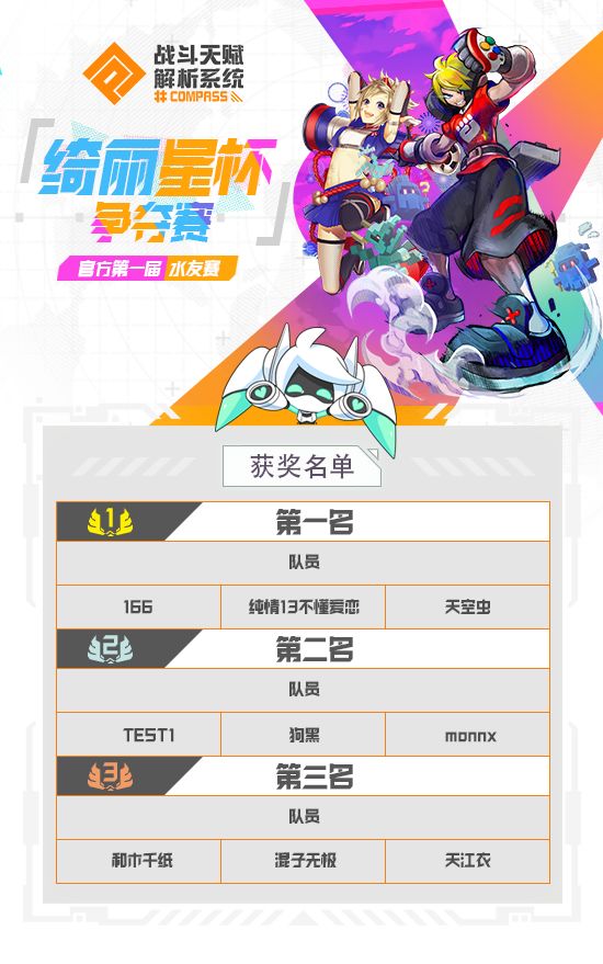 大家好!绮丽星杯争夺赛正式结束了,感谢大家的积极参赛!这次一共有32支队伍报名参赛。最后由166、纯情13不懂爱恋和天空虫三位玩家通过默契地配合和高超地操作拿下了官方第一届水友赛的冠军!TEST1、狗黑、monnx和和木千纸、混子无极、天江衣也分别拿下了第二名和第三名的好成绩!让我们恭喜他们ヾ(*>∀<*)战斗方面,双挽乃保、卢西安诺和梅古梅古成为本次水友赛中大家最喜欢使用的英雄。新
