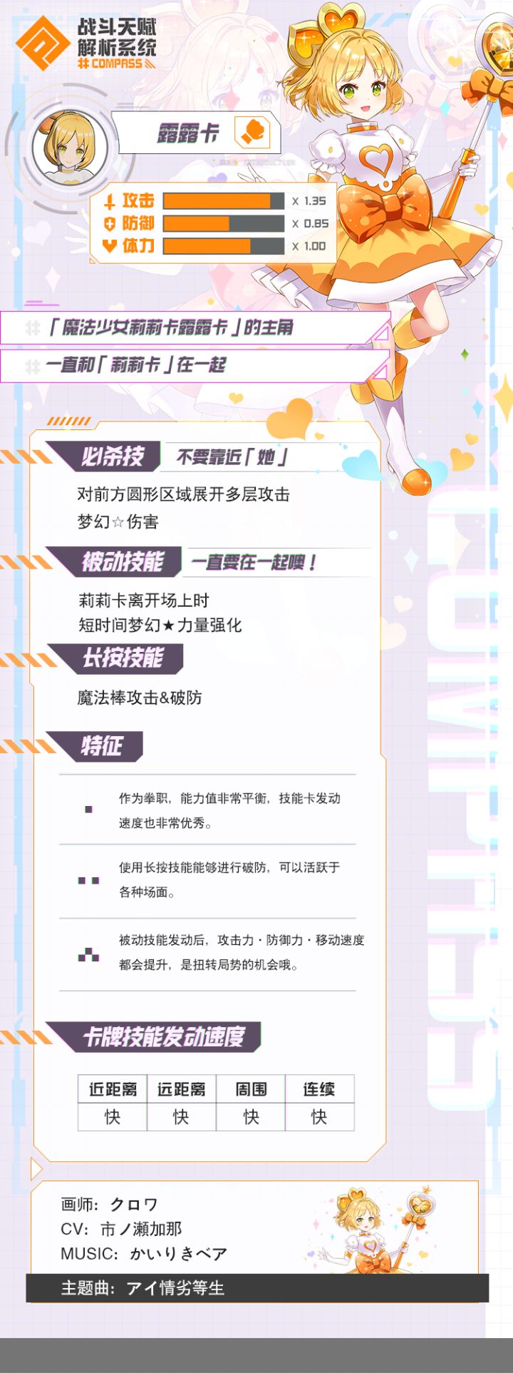 特点与玩法:自带近破的输出型美少女。作为优等生露露卡的四种卡牌发动速度都是快。在配卡上可以稍作大胆选择的同时,露露卡对蓄力熟练度要求较高,不够熟练的蓄力很难准确破盾。尽管如此,露露卡对身上带有防御卡的英雄仍然是极大的威胁。露露卡的必杀技是往指定方向释放强力的魔法攻击,会受到地形影响产生高低差并可以控制在墙面爆炸,有一定的清场/挡路效果,该伤害可以被防御卡抵挡。多用于开团/无敌挡伤害。露露卡在莉