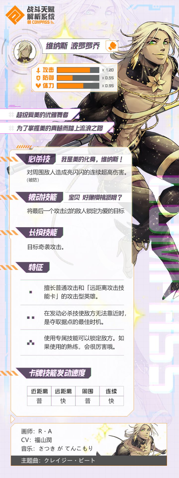 蓄力技能:目标奇袭攻击被动技能:宝贝 好像樱桃派哦?将最后一个攻击过的敌人锁定为爱的目标必杀技:我是美的化身,维纳斯!对周围敌人造成亮闪闪的连续超高伤害(破防)特点与基本玩法:波罗罗乔是一个被动特殊,自带背刺快速回场的英雄,能很好的做到救场的工作,大招能够配合队友拿点进行封路。波罗罗乔能在战场上做到骚扰、输出、守点都能顾及到,利用自身的被动可以进行回场救点,输出方式就是止住对方,然后