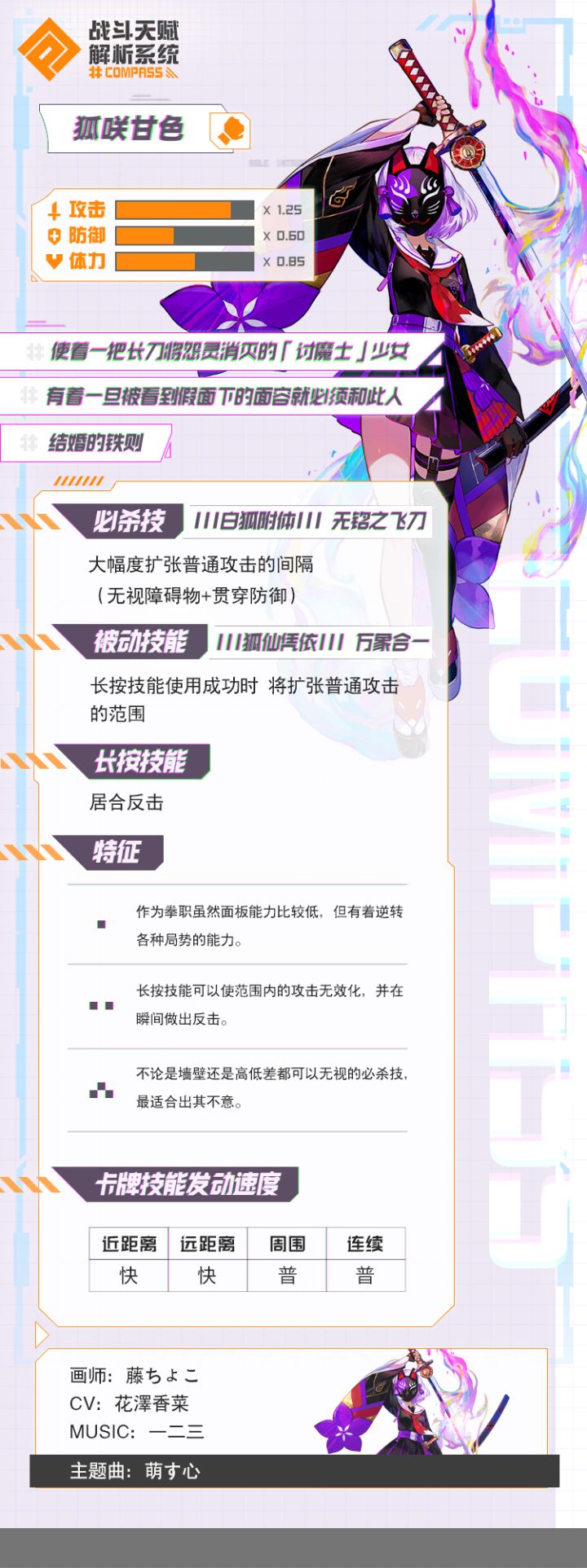 特点与基本玩法:狐咲甘色的攻击面板属于近战拳职中偏低的,但取而代之拥有超强的蓄力攻击与必杀,前4次普攻速度较快。蓄力攻击会生成圆形的反击圈,可以无效一次圈内的攻击(包括普攻、近卡、蓄力突进、圈内周卡)并突击过去击飞对方(突击会带有一小段无敌时间)。英雄被动是当蓄力攻击成功时,会短时间内增加攻击范围,可以无需移动就可以追打到被反击浮空的敌人,蓄力的发动与取消时间都相对较短,可以反复开启,需注意