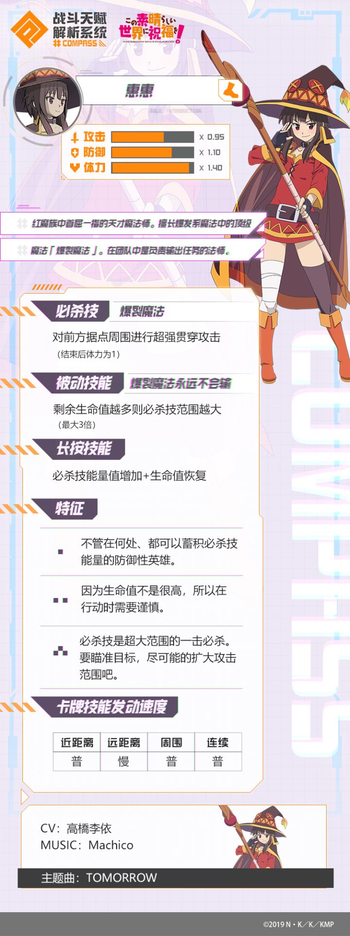特点与玩法:高体力型防御型职业,虽然没有能对队友增益或对敌方削弱的技能,但是拥有一个极强的大招,超大范围的持续贯通99999伤害,盾卡和单反无法抵挡,对方能做的只有开大或逃离,但是开大后自身会剩余一滴血,所以要确保自己在安全位置开大。同时惠惠拥有一个可以同时回血和积攒大招条的蓄力技能,使惠惠可以踩在敌方据点内,防止对方攒大的同时自身攒大。作为防御角色,开局优先取得C点或敌方二点。随后前线骚扰敌