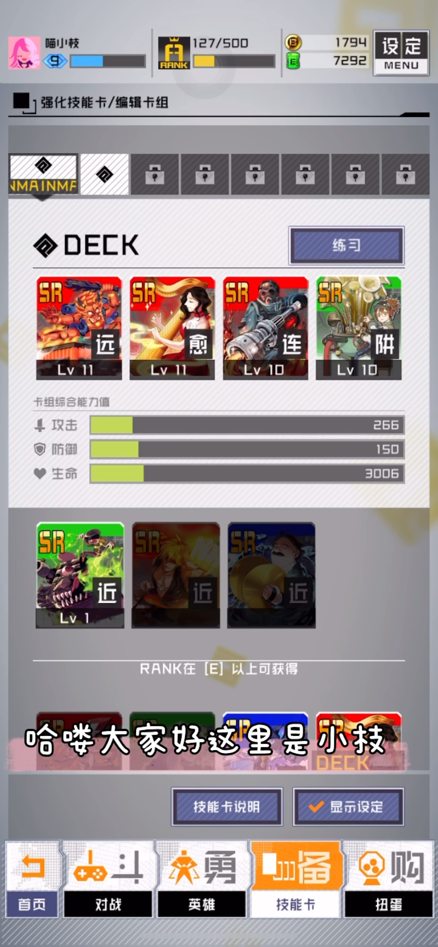 以下配卡兼顾面板数值与效果,技能卡缺少时可以使用下位技能卡代替。常规配卡黑心警官 汤米 / 死献药 斯塔克 · 死神 / 帝皇机神 猎人王 / 乐团员 竖琴同样是以平a为主要输出方法,均用入手难度较低的技能卡替换。以一张【近止】为主要控制手段,用来起手辅助平a的特效,达到一个能多次击倒对方效果。【近破】为对【防】卡进行输出,【愈】和【防】卡进行续航的卡组。【防】卡可使用无发动时间的【防】进行