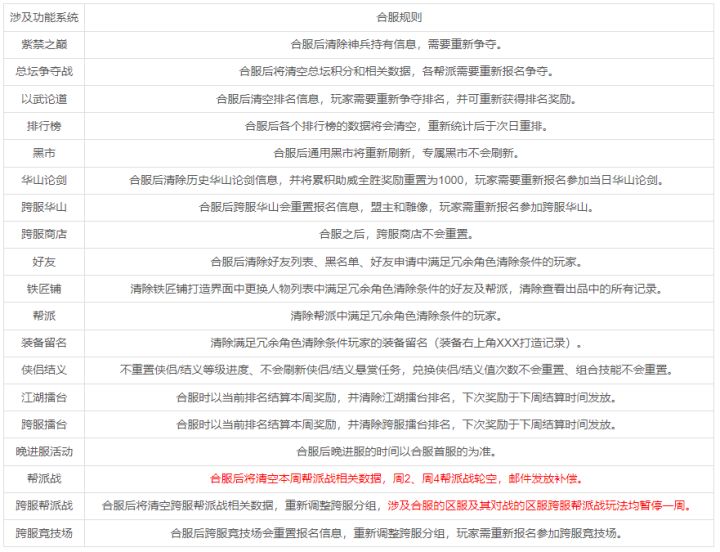 尊敬的各位玩家: 为了给每一个喜爱《铁血武林2》的玩家提供更好更全面的游戏体验,享受到更多游戏的乐趣和挑战及结识更多的志同道合的朋友,《铁血武林2》顺应广大玩家的需求,进行数据互通。《铁血武林2》将在8月1日14:00-18:00对风云再起1服-12服服务器分别进行合并合服处理。服务器会根据合服操作完成时间提前或者延迟开启,请玩家密切留意官方网站及官方QQ群消息,不便之处敬请体谅!一、【合服规