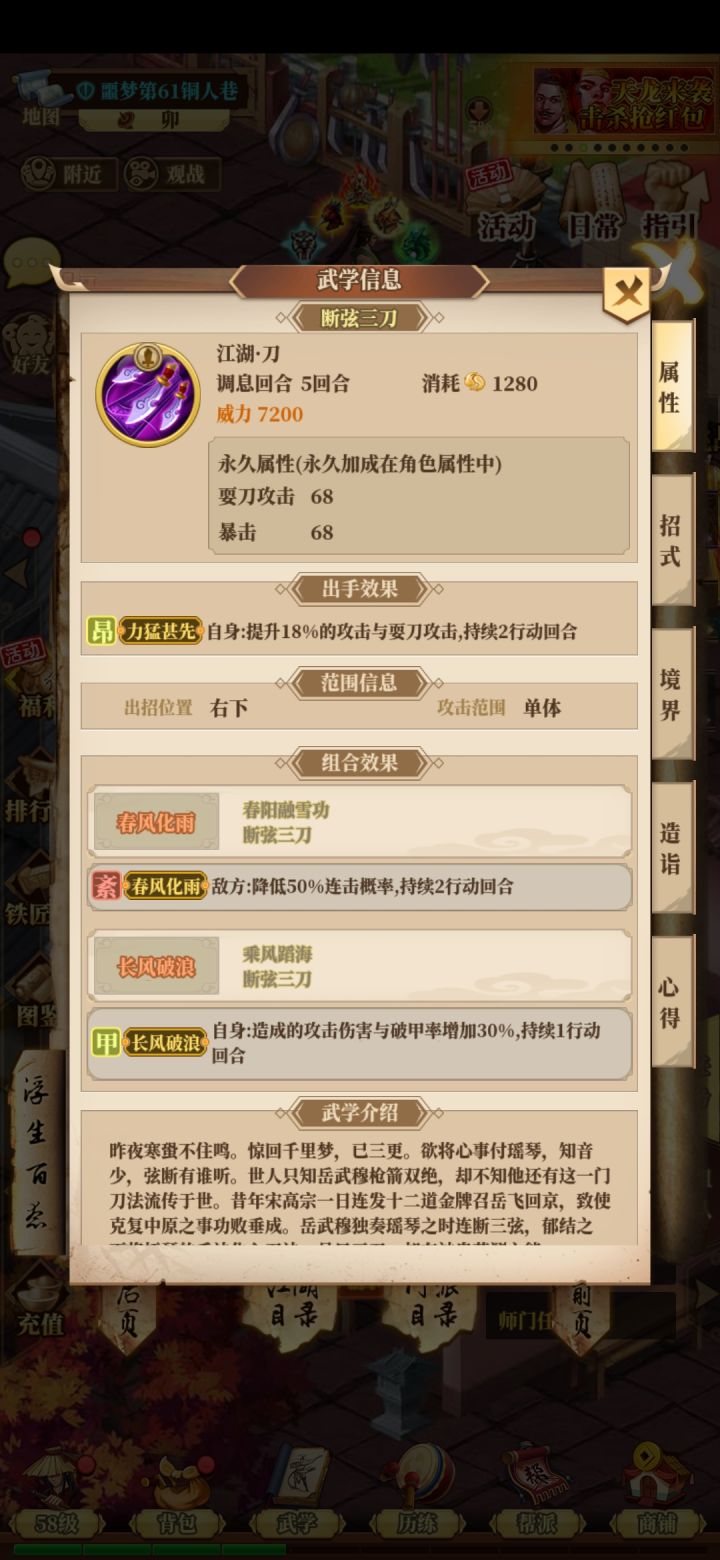 我写一期玩刀流派的攻略吧!首先新区进去从血刀或铜人,神刀等有刀的门派选一个人,然后赶快升级弄银两去京城黑市呼啦那里抢刀,新区七天,高氪可以直接生死刀诀,牛刀开局,低氪还是从生死刀诀,四形刀诀,紫的帮派商店有,160一本当然不管哪种狂风刀法是必备的,弄强化宝石,最好是8生命四攻击四聚气开局,过了40级再弄暴击或连击宝石,金武开到什么用什么当然是好用的,比如止一刀法,鸳鸯刀法,两极归一刀法,新区7天主推战力;等7天完了,低氪估计都生死刀诀,牛刀快出了,高氪都牛刀可叠境界了庖丁解牛刀升一阶,御膳房刀可多叠几阶,再50一60级可以出惊天动地了,60可以用鸳鸯刀法,两极归一刀法,止一刀法自创,60左右红套可以换索命阎罗组合,火焰刀法,血斩千刀,割鹿刀法;如果你要换一刀流也可以,不过自创配合索命阎罗更猛,刀本来走爆发路线;70一80换擂台金武,本人推荐断弦刀,单体不说,又加伤害,当然洗髓经是必备的,轻功自创就行不管成不成功都加聚气,放着也可以,本期就讲那么多了!