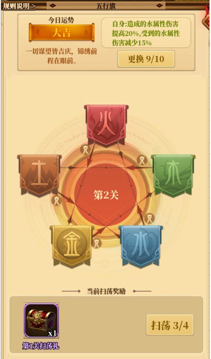 玩法简介成为门派七阶弟子后,可通过挑战五行旗副本,获得五行、造诣、气海系统相关培养道具。参与条件开启等级: 达到门派七阶五行旗界面入口通过【历练】→【个人】 →【五行旗】 进入详细介绍1.开启时间:全天2.运势说明【今日运势】每天24:00刷新,评价品质越高,高品质运势BUFF出现的概率越大。点击【更换】按钮仅随机更换运势BUFF,运势评价不改变。 3.挑战方式每一关内,有