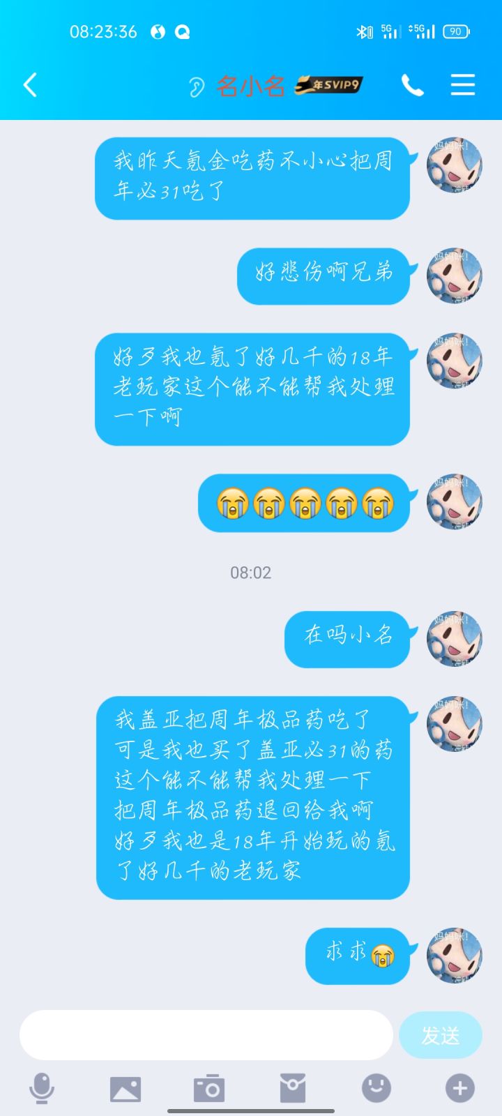 破防时刻😭裂开我盖亚把周年极品药吃了可是我也买了盖亚必31的药这个能不能帮我处理一下把周年极品药退回给我啊好歹我也是18年开始玩的氪了好几千的老玩家