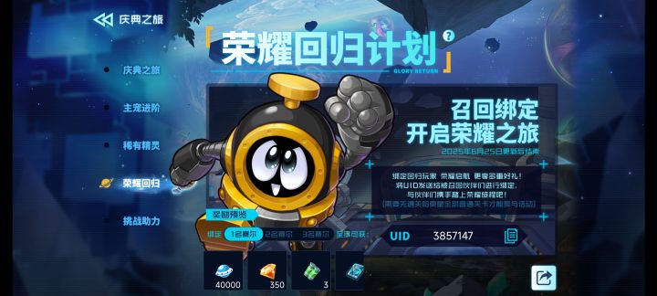 赛尔号手游荣耀回归计划震撼上线!绑定我的邀请码:3857147参与活动至多可获得十连补给券x3、强力高级精灵x2、钻石x950、高级天赋药x1以及海量经验特性改造芯片等养成道具,现在登录https://s.61.com/立即领取吧!