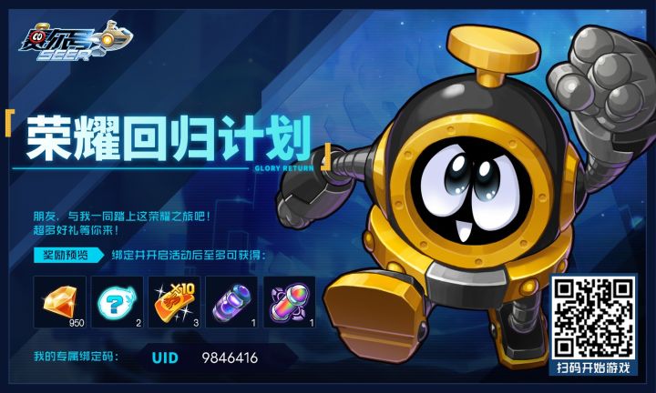 赛尔号手游荣耀回归计划震撼上线!绑定我的邀请码:9846416,参与活动至多可获得十连补给券x3、强力高级精灵x2、钻石x950、高级天赋药x1以及海量经验特性改造芯片等养成道具,现在登录https://s.61.com/立即领取吧!