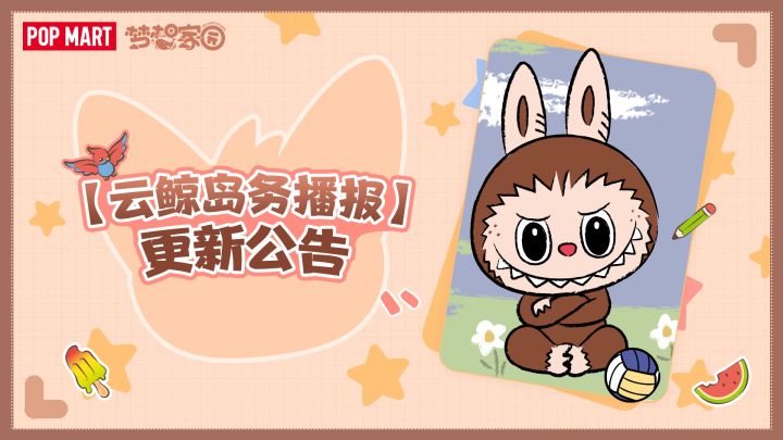 各位绘梦师:云鲸岛将于7月11日下午5:00进行不停服维护更新,更新维护后将发放晶钻*60,棉花糖*1的更新维护奖励,届时绘梦师重新进入游戏即可完成更新,以下是更新内容:1.扩充背包:背包每次升级从增加50格变成增加100格,已经完成过背包升级的绘梦师将会一次性获得额外的背包容量扩充。2.钓趣狂欢节中的奖品兑换新增家具兑换:精灵冲浪板架、LABUBU稻草人、精灵蚊香3.神秘商店兑换奖励中掉落