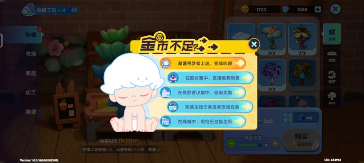 这一堆红点是真难受,别提醒了行不行!我是不买吗,我是买不起好吗!!优化了个寂寞,给一万够干嘛,把物价和升级建筑所用金币降低啊,一个花种子500,做一个云海木板1000,做啥东西都需要金币。