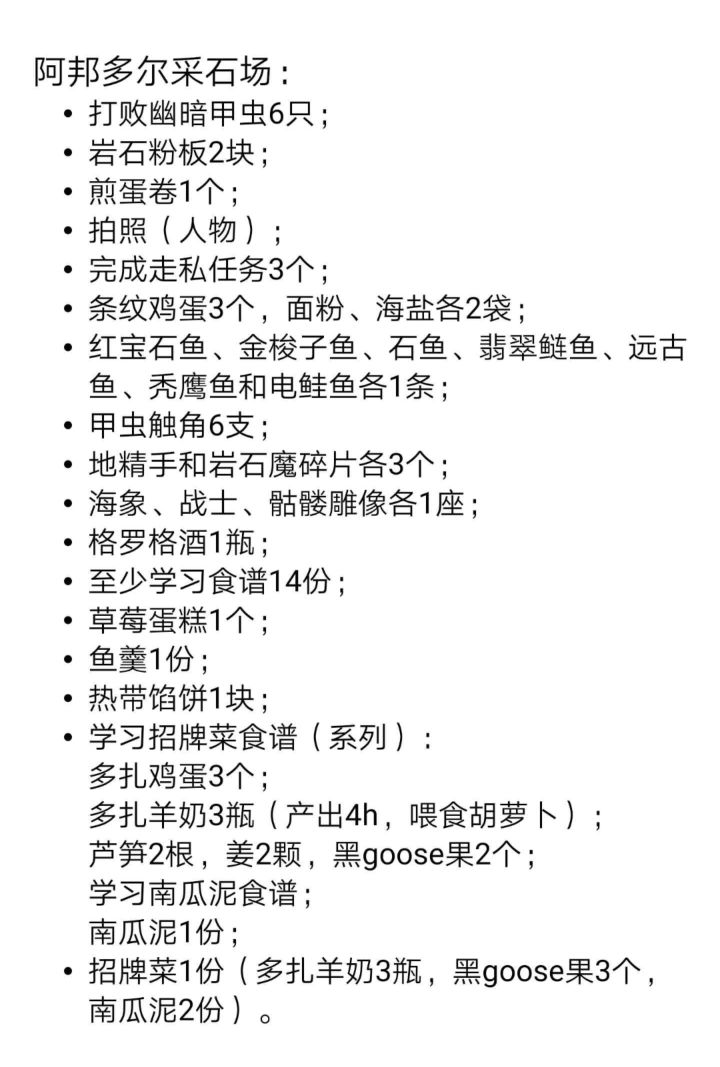 开了多扎之后感觉像重新玩了一样😂全新的草丛、果树、农场等一系列资源,全都要重新积攒,本就不堪重负的仓库看了瑟瑟发抖。为了方便大家规划仓库的物资管理,免得步我后尘,故做此攻略。像把多扎石鱼卖掉这种傻事还是别做的好,还有放着两天南瓜不采(仓库满了工作台也没停过),转脸主线npc就问我要南瓜泥,然后南瓜两天后才刷…以下为具体流程多扎矿山任务已全因为缺两条多扎石鱼,所以少一个矿石蛋糕,矿工房子只能