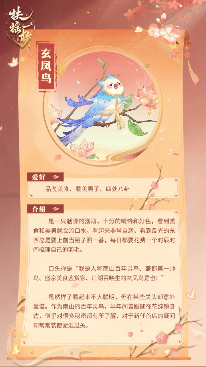 啾啾啾啾啾!天地翱翔间,尽收江湖事——本灵鸟是也!又到了本鸟最爱的八卦聊天时间啦——今日我们来聊聊户部尚书的独女,屈素弦。之所以想说说这位屈姑娘,是因为......(傻笑)今日本鸟在树上救下了一只——木鸢。嗯...首席大人没有听错,反正屈姑娘是这么认为的,她反复感谢本鸟,说我是木鸢的救命恩人!喏,这儿香气四溢的芙蓉酥桂花糕九层糕吉祥果甘露饼都是屈姑娘相赠!屈素弦乃当今盛朝的户部尚书独女,自是颇