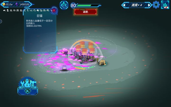 先上图,一局只要手机抗的住,几百万砖石随便刷开局阶段,0费的技能先拉满一个。然后补给优先选5钻石,次选伤害。直到把基地的砖石保留拉满,前期就结束了。中期阶段,这时候有1到2个技能拉满,优先技能是巨锚,斩杀线越高越好,其次可以补伤害,或者把逢7拉到6,这样配合半价可以点1次技能给1次0金币升级,快速升满高费用技能。后期阶段,能打随便打60以上关卡,优先之中的优先补给箱,到5以后每过一回合可以点