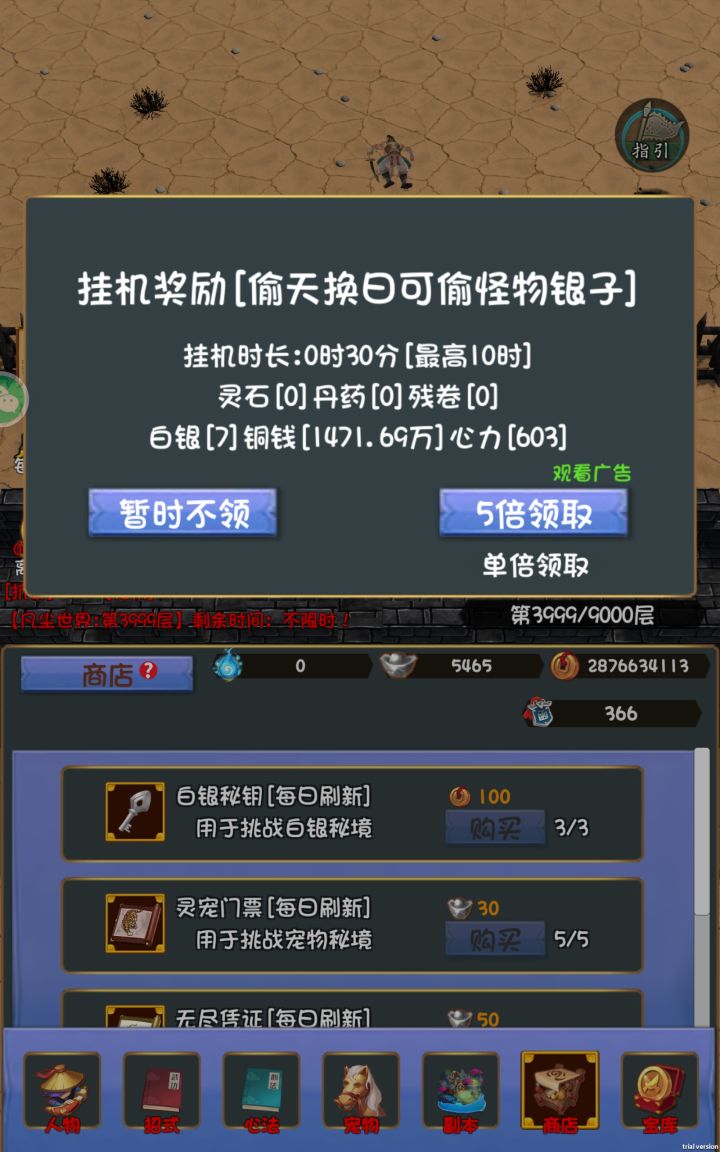 第一天进游戏,用完兑换码。打50关解锁商店,可以升几级送的传说宠打的快一点。花25w到30w白银买玄铁,升级武器3000级,衣服1800级,头盔3000级,鞋子3000级。剩下的随便点一点鞋子或头盔。买一本偷天换日,买降龙十八掌,升级蓝色技能满级,升级紫色技能70多级,然后攒100w升级十八掌。心法随便点点,后面升铜币。推图推到3000多关,有条件的可以2399关开始挂机了,攒铜币。没