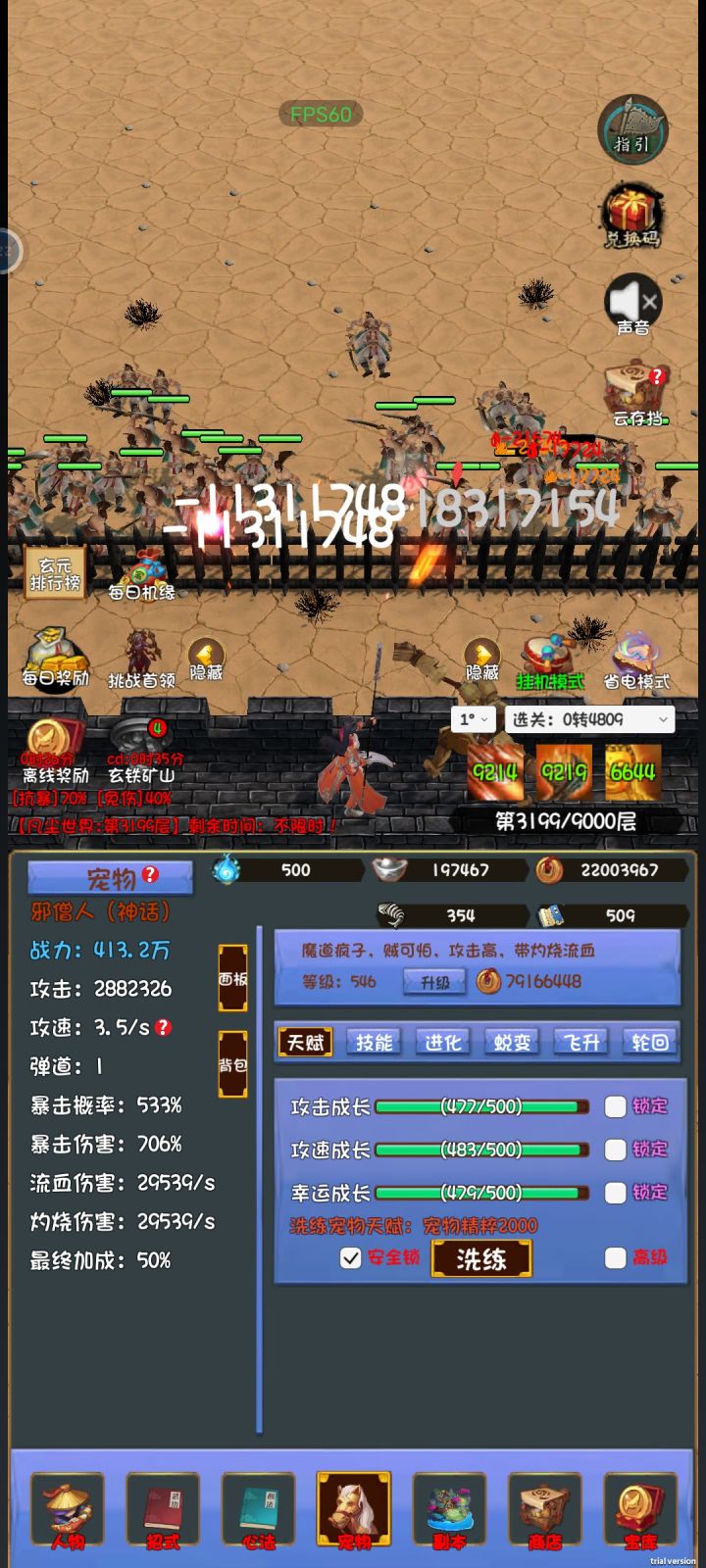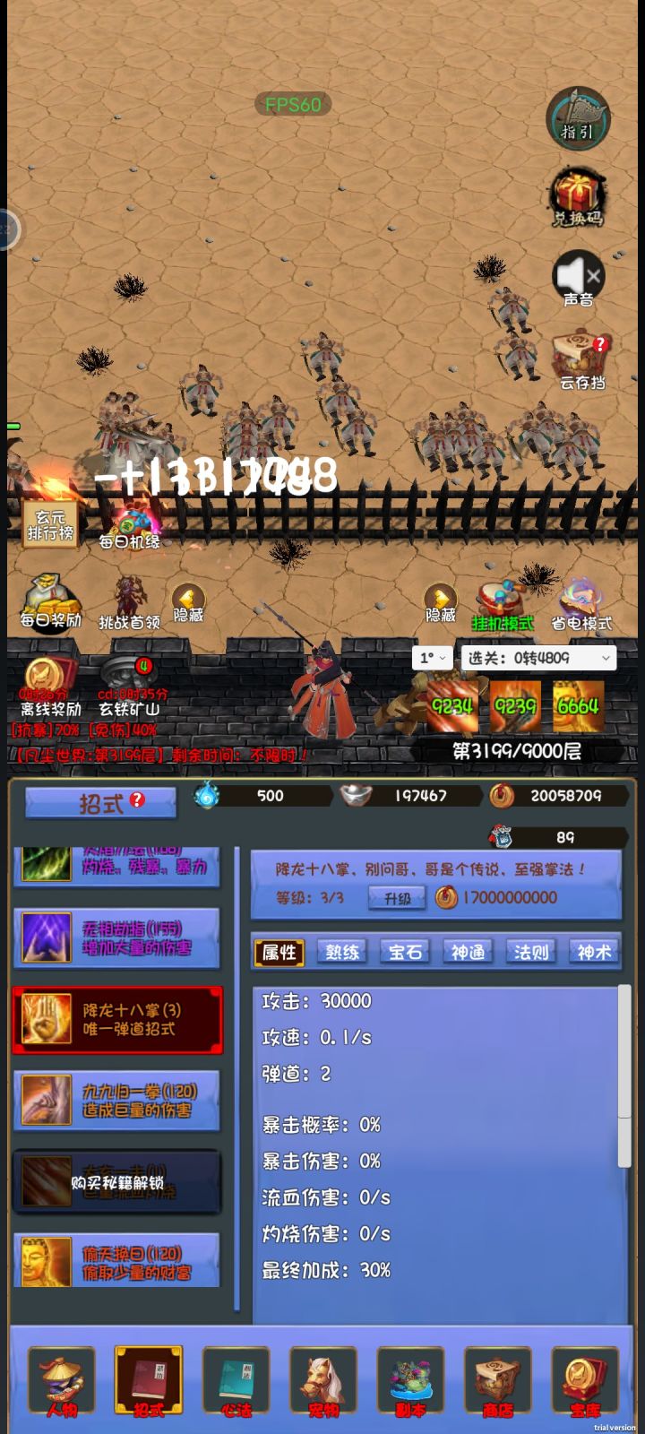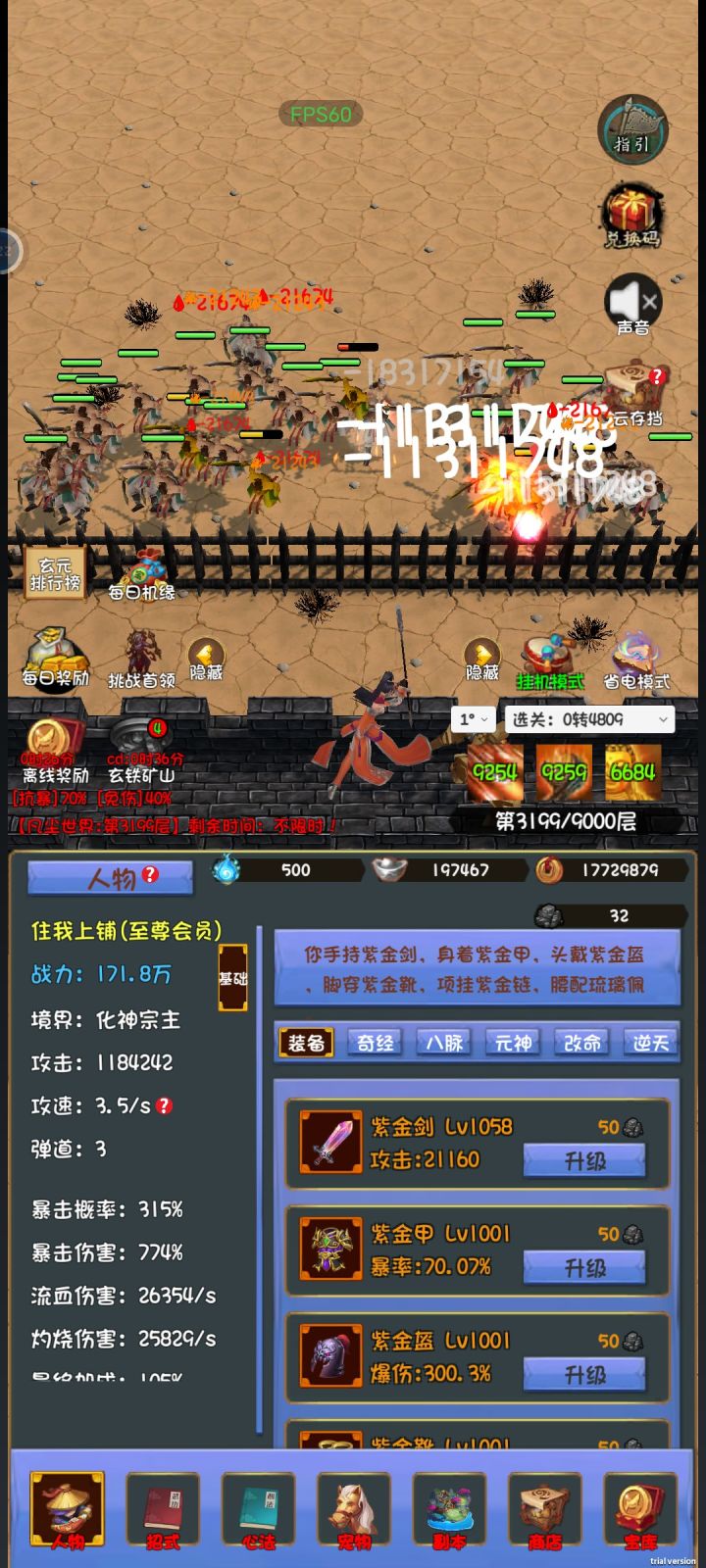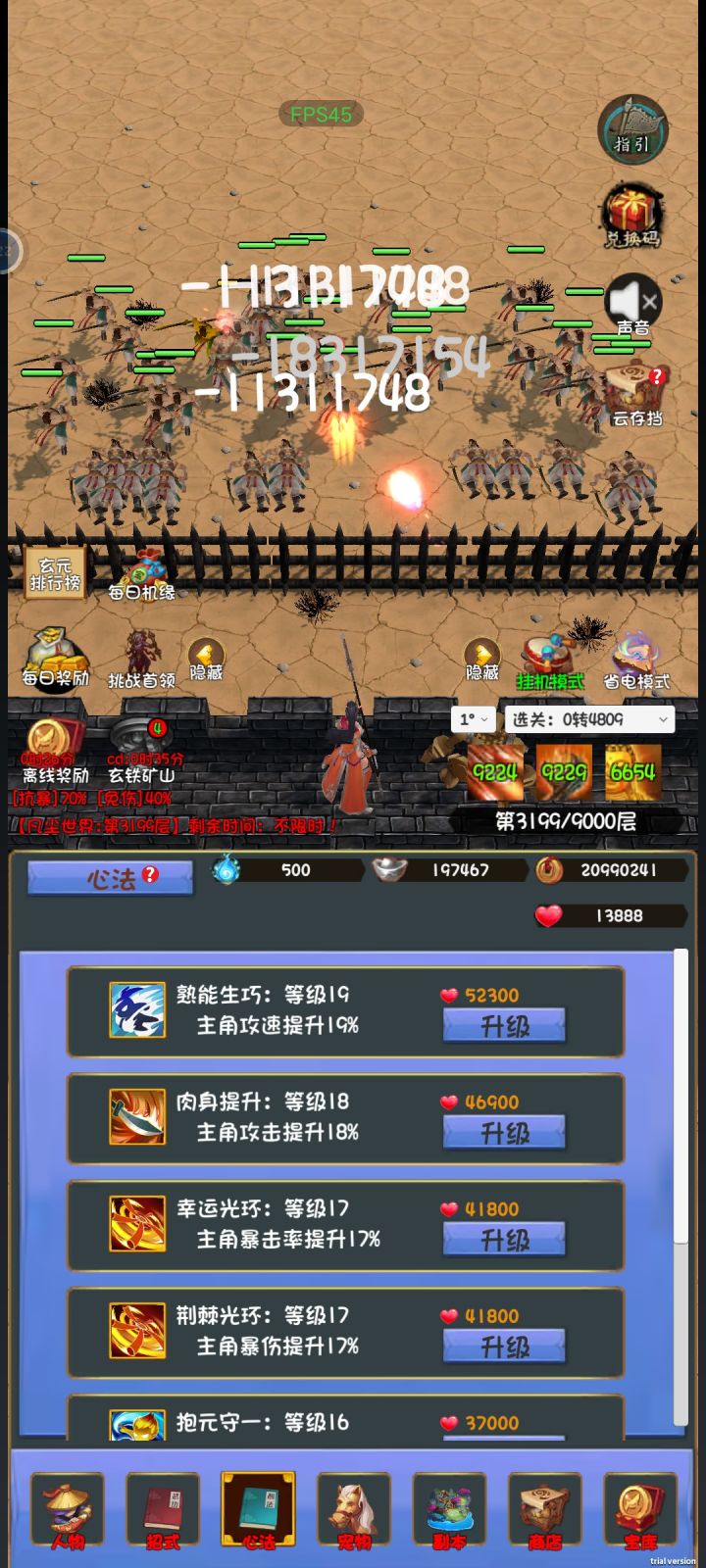6.闯关挂机,保持秒杀或者两刀一个挂机怪的关卡挂机,收益最大化。闯关时怪物血量为挂机怪物血量的两倍(某些怪少的关卡除外)