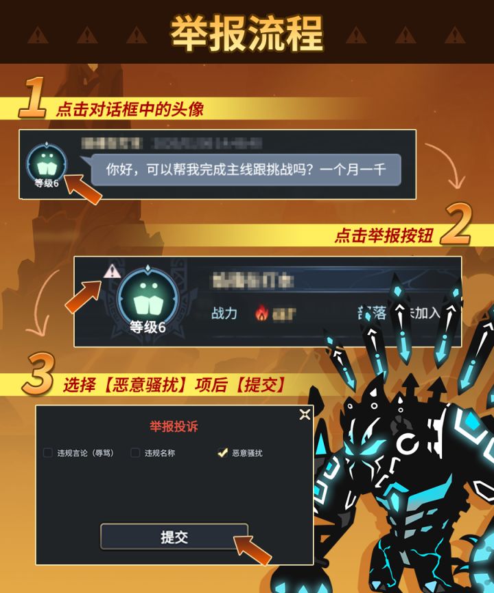 亲爱的探索者:最近我们发现,部分不法分子正在通过游戏内私信诱导探索者代练、进行不明充值、提供个人信息。这些行为属于诈骗行为,请大家务必小心!以下是我们提供的防范建议:1.切勿轻信非官方渠道:官方不会主动私信玩家要求提供敏感资料或引导充值,请谨慎处理来自未知来源的信息。2.确认官方账号:请在官方账号及游戏内公告中确认官方讯息,并避免与陌生人分享个人信息。3.警惕游戏内诈骗:有些玩家会伪装成