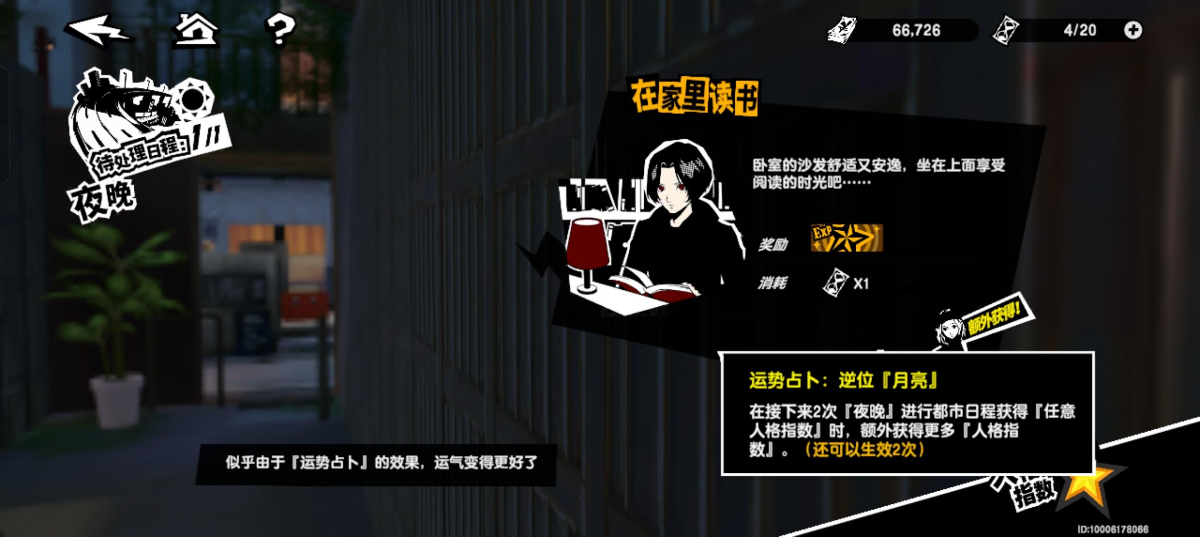 占卜抽到月亮,结果在傍晚的活动就开始提示有占卜增益效果,人格点数未额外增加。然后第二天的早上地铁读书,放学打工同样提示有增益效果...