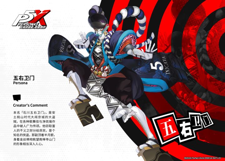 >>>PERSONA!『五右卫门』介绍本名「石川五右卫门」,是安土桃山时代大闹京城的大盗贼,在各种歌舞伎与净琉璃作品中被人广为传颂。他窃取富人的不义之财分给庶民,是个知名的侠盗。那副顶着半月额,身着金丝棉袍眺望南禅寺山门的形象相当深入人心。————觉醒,你的另一面!————【更多福利欢迎关注】官方微博:官方微信:女神异闻录 夜幕魅影官方16群:官方17群:官方18群:官方19