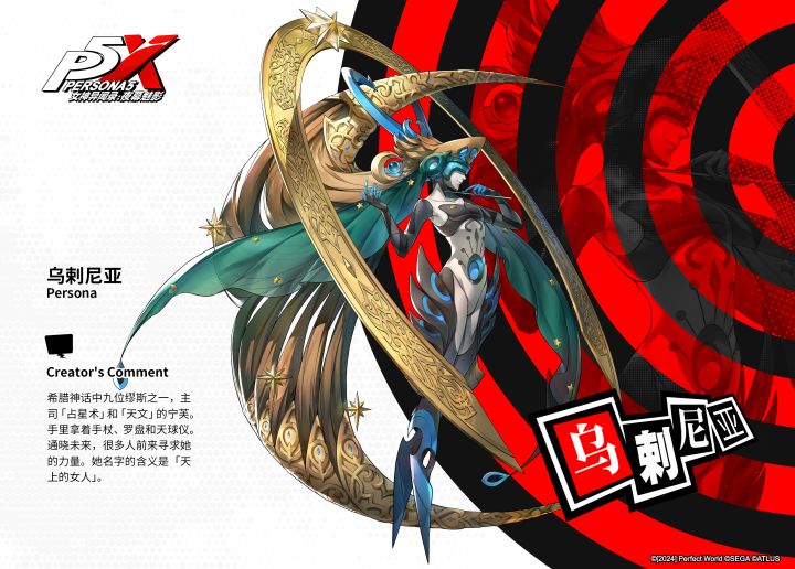 >>>PERSONA!『乌剌尼亚』介绍希腊神话中九位缪斯之一,主司「占星术」和「天文」的宁芙。手里拿着手杖、罗盘和天球仪。通晓未来,很多人前来寻求她的力量。她名字的含义是「天上的女人」。————觉醒,你的另一面!————【更多福利欢迎关注】官方微博:官方微信:女神异闻录 夜幕魅影官方16群:官方17群:官方18群:官方19群:官方20群:#女神异闻录夜幕魅影 #p5x